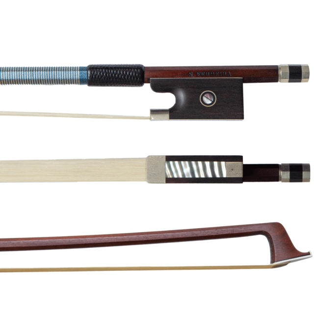 Arco de violino Samuel Ferreira, fabricado no Brasil, corpo em Pau Brasil de altíssima qualidade, talão em ébano olho paris, com montagem do talão em níquel, ponteira em osso, guarnição com linha, verniz natural, corpo octogonal, crina animal e peso 61,1 gramas.