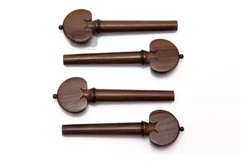 Jogo de cravelhas para violoncelo 4/4. Fabricadas na Índia, estas cravelhas são feitas com Jacarandá Indiano, no estilo Heart (modelo coração com pino e argola em ébano).